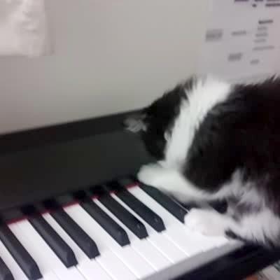 A cat walks on a piano keyboard inadvertently playing music then falls down.