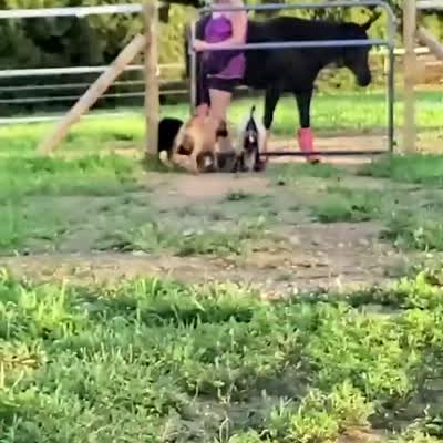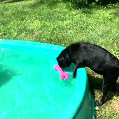 A black Pug dog struggles to get a toy out of a kiddie pool because she is too short. Another dog ends up taking it out of the pool for the Pug dog.