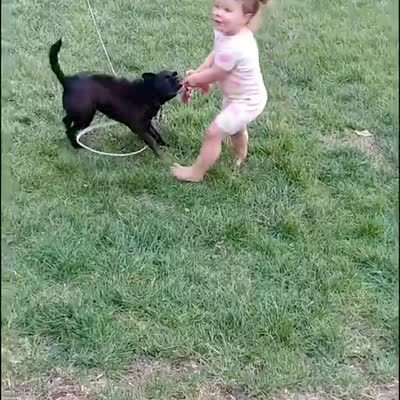 While a tot girl tries to play tug-of-war with a dog she gets jerked and pulled around which causes her to trip and fall in a yard.