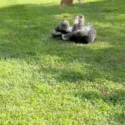 Two dogs play with each other in yard. The larger dog kicks the smaller puppy into the air.