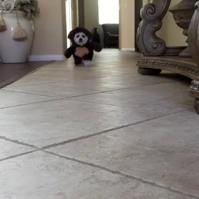A small white dog in a bear costume runs up to a woman, and it looks like the bear body waddles.