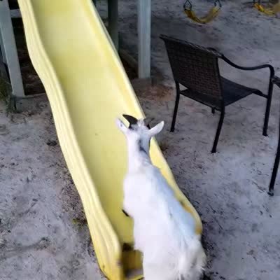 A goat tries to run up a slide and repeatedly slips down until he climbs up into a play house in the yard.