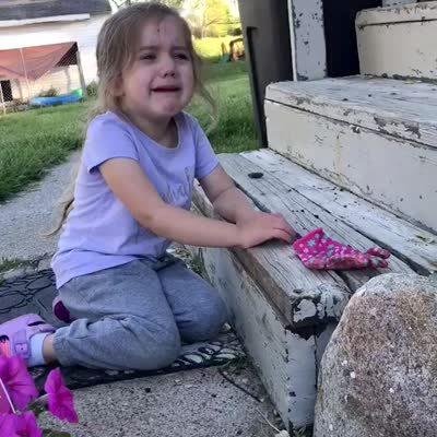 A tot girl cries because she lost her "wormy friend" and says he was "so adorable". Then she sees him on the ground and says "oh there he is" in the yard.