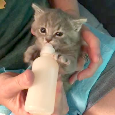 A woman feeds a kitten cat that shakes its paws when it drinks from a bottle in the house.