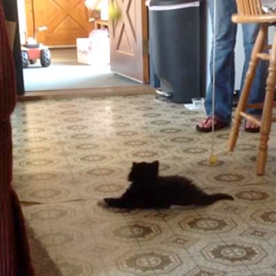 A kitten cat jumps around while a woman bounces a ball indoors repeatedly.