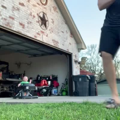 A baby boy laughs every time a man swings a golf club in a front yard.