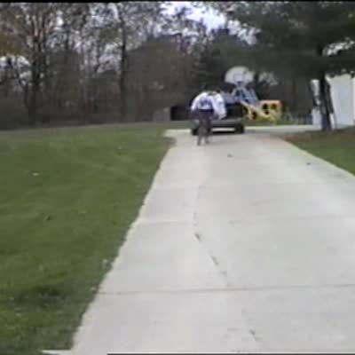 A man pops a wheelie while he rides a bike in the driveway and falls backwards off the bike. Home security camera