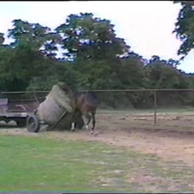 Horse follows large bale of hay on back of tractor, puts front legs on top of hay.