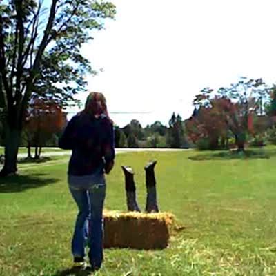 Teen girl dances on a bale of hay, she jumps off and falls over.