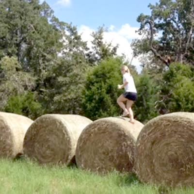 A young girl repeatedly stops and starts as she tries to jump from one hay bale to another. When the girl jumps, she falls short and hits the ground.