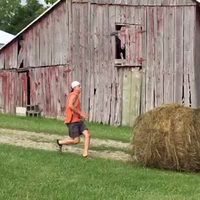 A young boy runs across the top of hay bales on a farm and jumps across a gap between two bales. He hits the edge of the other bale and falls to the ground.