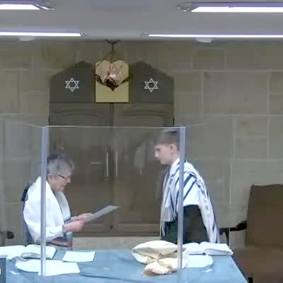 A woman rabbi and a teen boy stand on either side of a table during his Bar Mitzvah. As the woman reads to the teen boy, the teen boy faints.