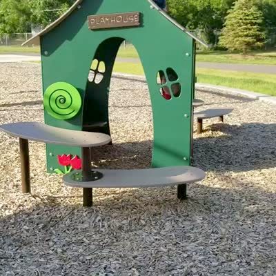A woman climbs on top of a playhouse in a playground park. She flips and falls next to her tot boy son and he throws bark in her face.