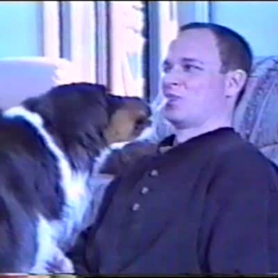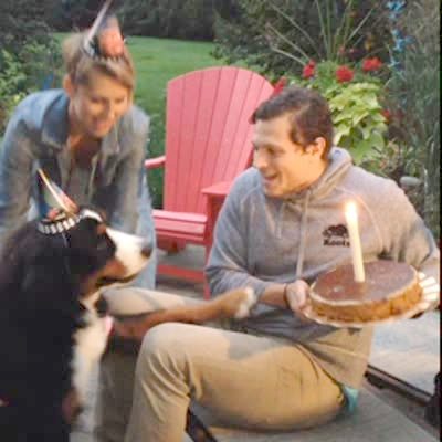 A man and woman sing Happy Birthday to a Bernese Mountain dog outdoors and he blows out a candy on a carrot cake. Short tail.