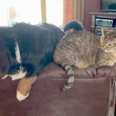 A Bernese Mountain Dog dog bites at a cat's tail while they sit on the back of a recliner chair in a living room, and the cat growls, then she hits the dog's face. The dog leans forward, then the chair tips over, and the cat and dog fall off of it.