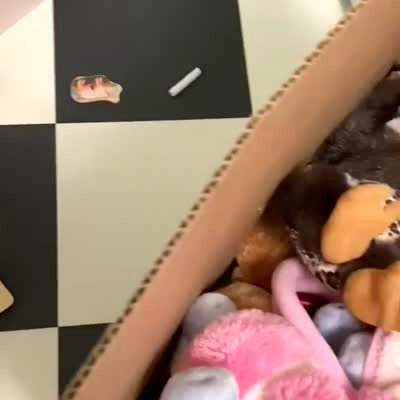 A young girl looks for her Bichon dog in the house. She finds him inside a moving box full of stuffed animals.