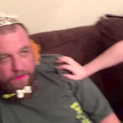 Teen girl puts makeup on her dad who sits in a chair. Wig and bow reveal. #AFVDad musical.ly AA