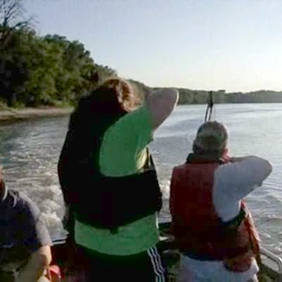 A man and two women ride a boat through a swarm of jumping fish outdoors on a river. One woman screams when several fish land in the boat.