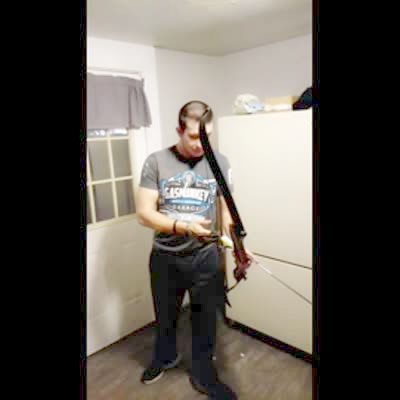 A man holds a bow and arrow. He shoots the arrow and his bow hits a ceiling light and breaks shatters it indoors.