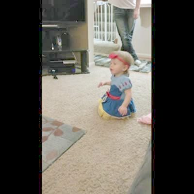 A tot girl looks up and a bow on her head while she spins around in circles in the living room.