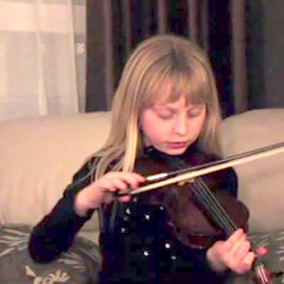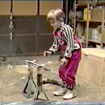 Boy plays with a sword, bows, says thank-you, and then turns, exposing a hole in his pants.