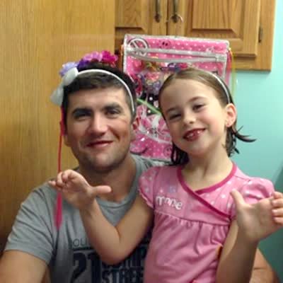 A man puckers his lips after his daughter has put makeup on his face and bows and a tiara on his head. AA: Makeup your dad.