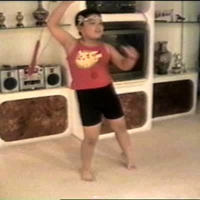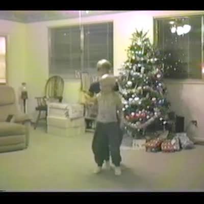 Two boys dance around a living room in front of a Christmas tree. The older boy tries to flip over the younger boy's shoulders, but lands hard face first on the floor, folding himself up on the floor. He stands up, continues his dance, and bows.