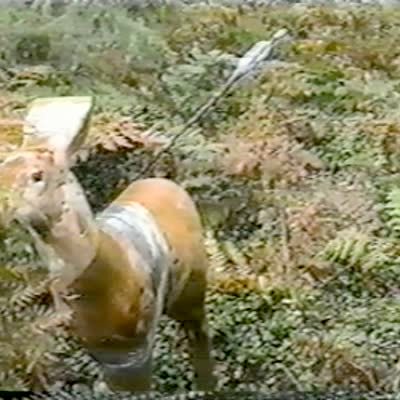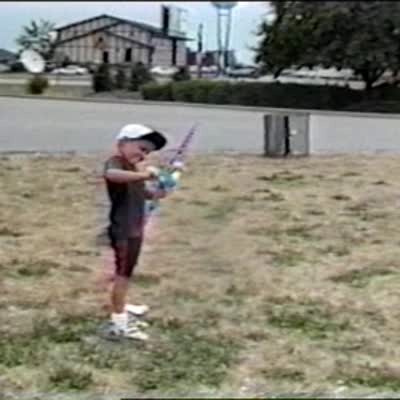 TOY BIZ. Boy shoots nerf bow & arrow at giant cow.