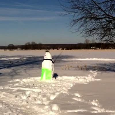 A man shoots an explosive arrow at a snowman and blows it up outdoors.