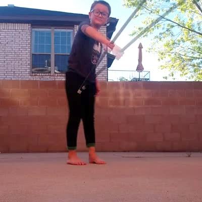 A young boy spins a bow staff on a driveway, then he hits himself in the groin with it and bends over.