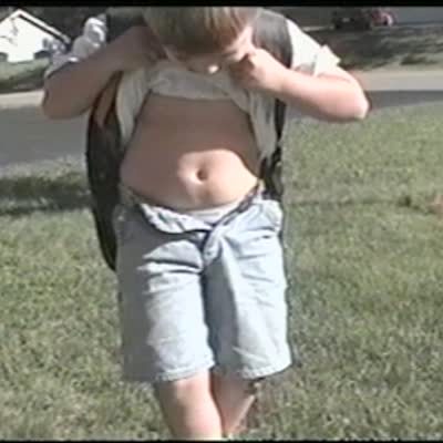 Tot boy gets off bus from first day of school. he tells his dad it went well but he had to walk around with his pants unbuttoned and unzipped all day because he couldn't zip them up himself and was too embarrassed to ask for help
