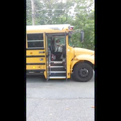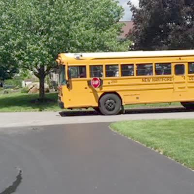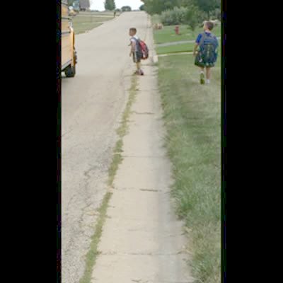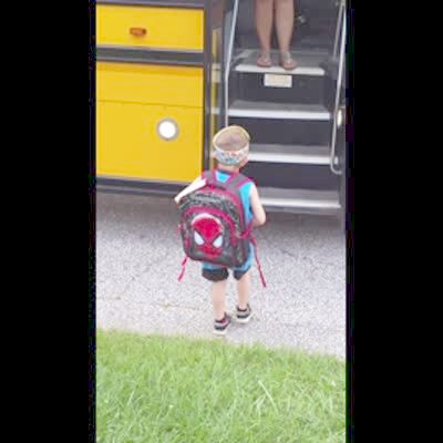 A young boy says that it is his first day of kindergarten while he stands in his driveway. He turns as his school bus drives right past him.