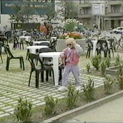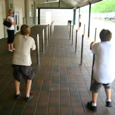 2 young boys hop over small poles at the bus station. Boy on the left hits his groin on one of the poles & gets stuck. Camera almost misses the action.