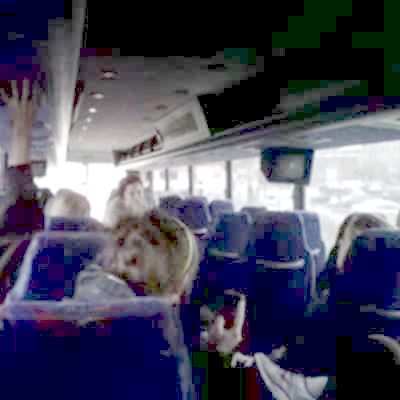 A teen girl sings along with the radio and dances on a school bus. She jumps and hits her head on the ceiling of the bus. The rest of the teen girls on the bus laugh at her. Dark clip.