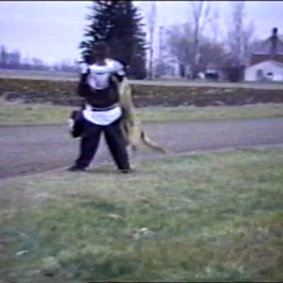 A woman in a Ghillie suit / camouflage suit pops out of a bush and scares three kids after they get off of a school bus.