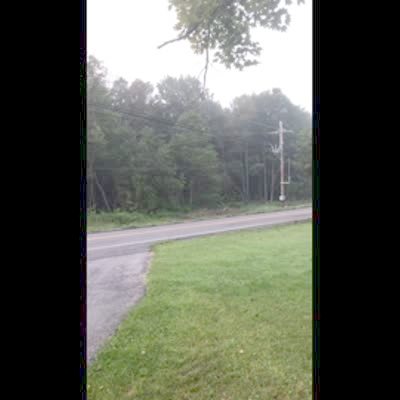 A person in a life-sized bear suit waits for a young boy to get off of a school bus, then they chase the boy down a road and crash into a pole. Social media video.