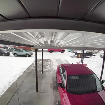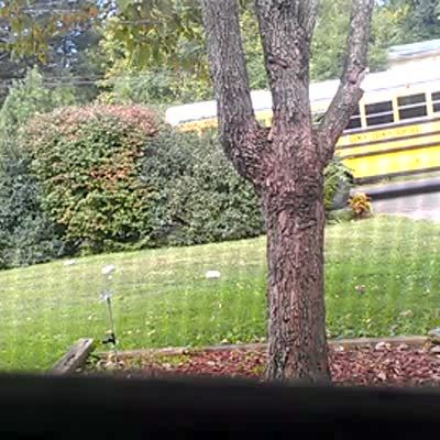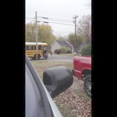 A teen boy walks of the front porch and slips on a patch of ice while he walks toward a school bus parked on the street and an adult male asks "are you alright," and walk toward the teen boy and then slips on the same patch of unseen ice to his back. Security footage.
