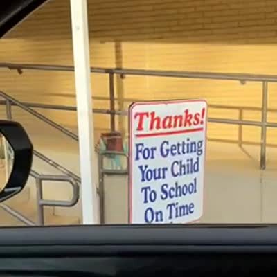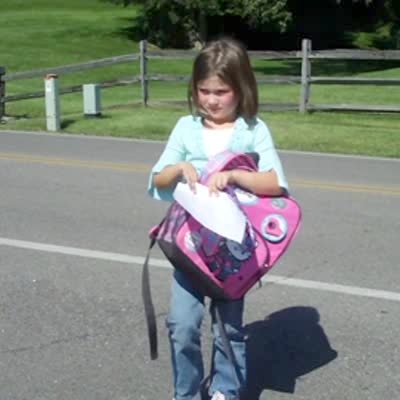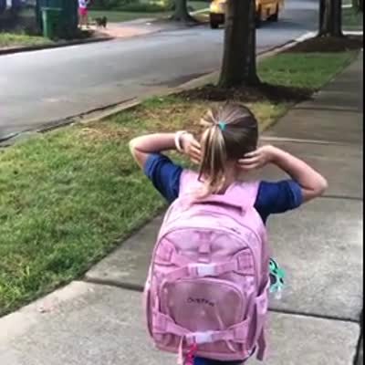 A young girl jumps for joy when she sees the school bus on her first day, but it drives right past her and she watches it in disbelief.