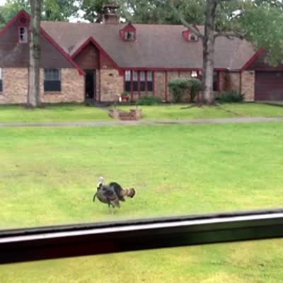 A turkey is walks around a yard outdoors as children watch from a school bus. One boy gets off the bus and the turkey chases him down the street.