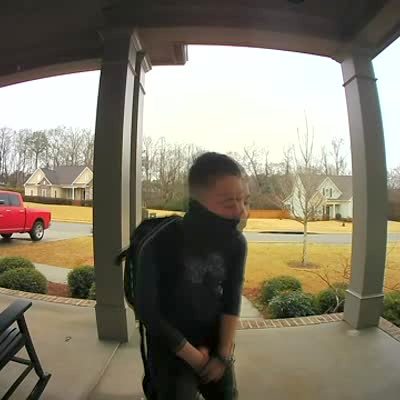 A teen boy celebrates that he is home from school and accidentally hits his groin in the front porch. Security Footage