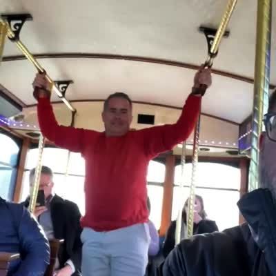 A man tries to lift himself sideways out from a pole on a bus but he falls on the floor. Featured talent cleared only (man on the pole).