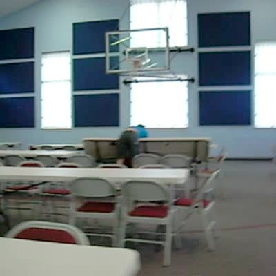 Young man hurdles over dining tables in a cafeteria. He falls but recovers. Bonehead.