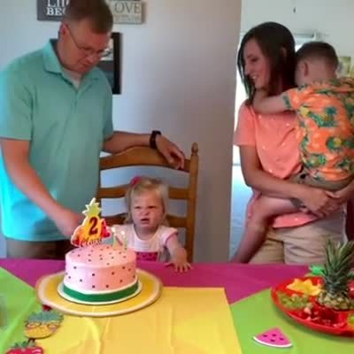 A family sings "Happy Birthday" to a tot girl in the kitchen and she yells "stop it." She makes an angry facial expression while the people continue to sing. She calms down when they stop. The man behind the camera asks her if they should sing again and she says "no." They sing anyways and she yells for her mom and repeatedly yells "no."