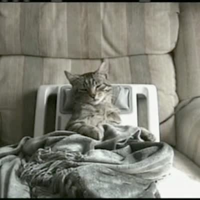 "Calming The Kitty" Young girl puts back massager on cat's neck. Cat likes the massage it gets.