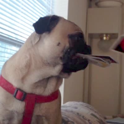 A girl puts UNO playing cards into a pug dog's mouth as the pug sits on a couch and holds them in his teeth.