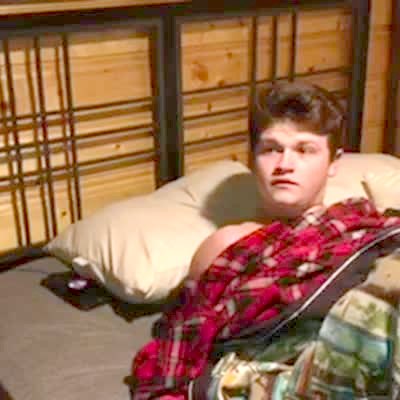 A teen boy yells in fear while a man in a Santa costume sings Jingle Bells in the boy's bedroom to wake him up. The boy looks around confused while his family calms him down.