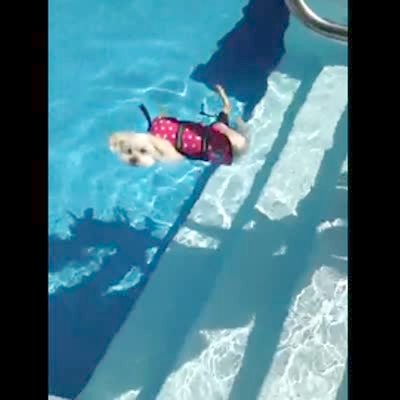 A terrier dog lies sideways calmly in a pool wearing a life jacket outdoors.