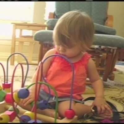 Tot/ baby girl plays with a toy and a dog runs by and knocks her toy away. She doesn't cry or even seem to mind.
