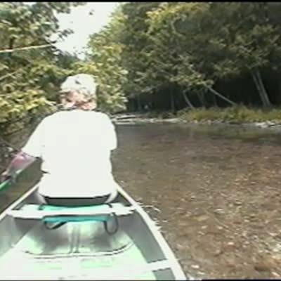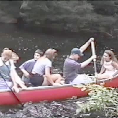 Canoe race with families on a pond. music plays over action. One of the canoers turns another couples boat over.
