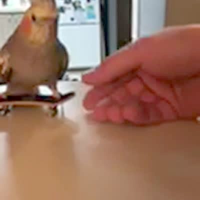 A man pushes a toy skateboard with a cockatiel bird on it down a cardboard ramp on the kitchen counter, and the bird rides on the skateboard.